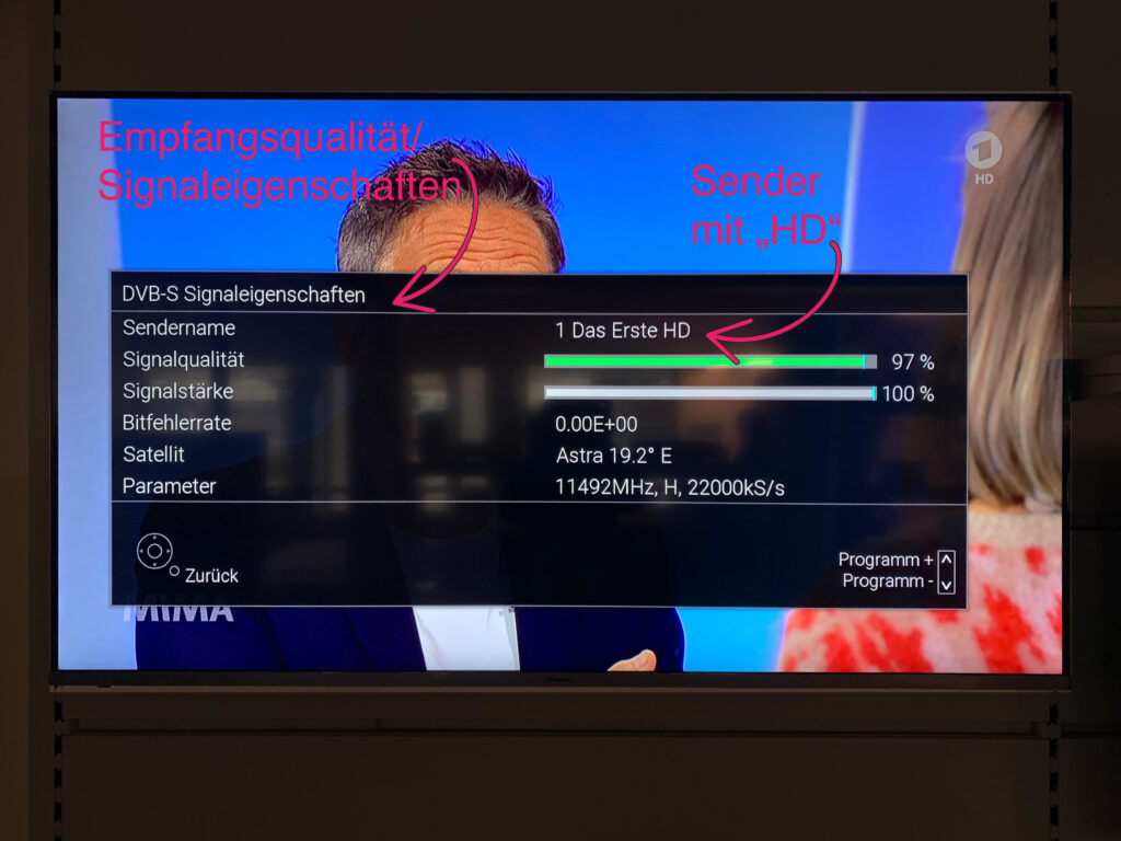 ✔ Wird bei der Empfangsqualität des laufenden Programms „HD“ angezeigt? Die Empfangsqualität kann in der Bezeichnung je Fernsehtyp variieren und kann über das Menü des Fernseher aufgerufen werden.