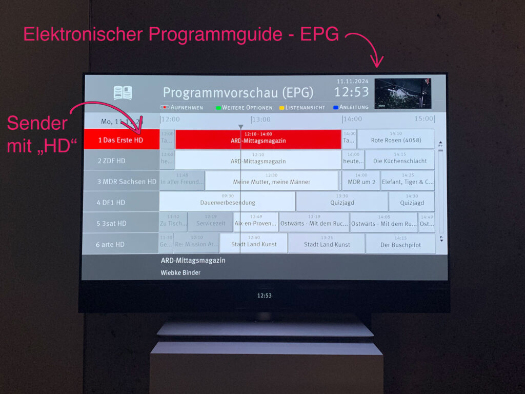 ✔ Steht in der Programmliste oder in den elektronischen Programmguide (EPG) Ihres Fernsehers ein „HD“ bei den aufgelisteten Sendern? Betätigen Sie dazu die jeweilige Taste auf Ihrer Fernbedienung.